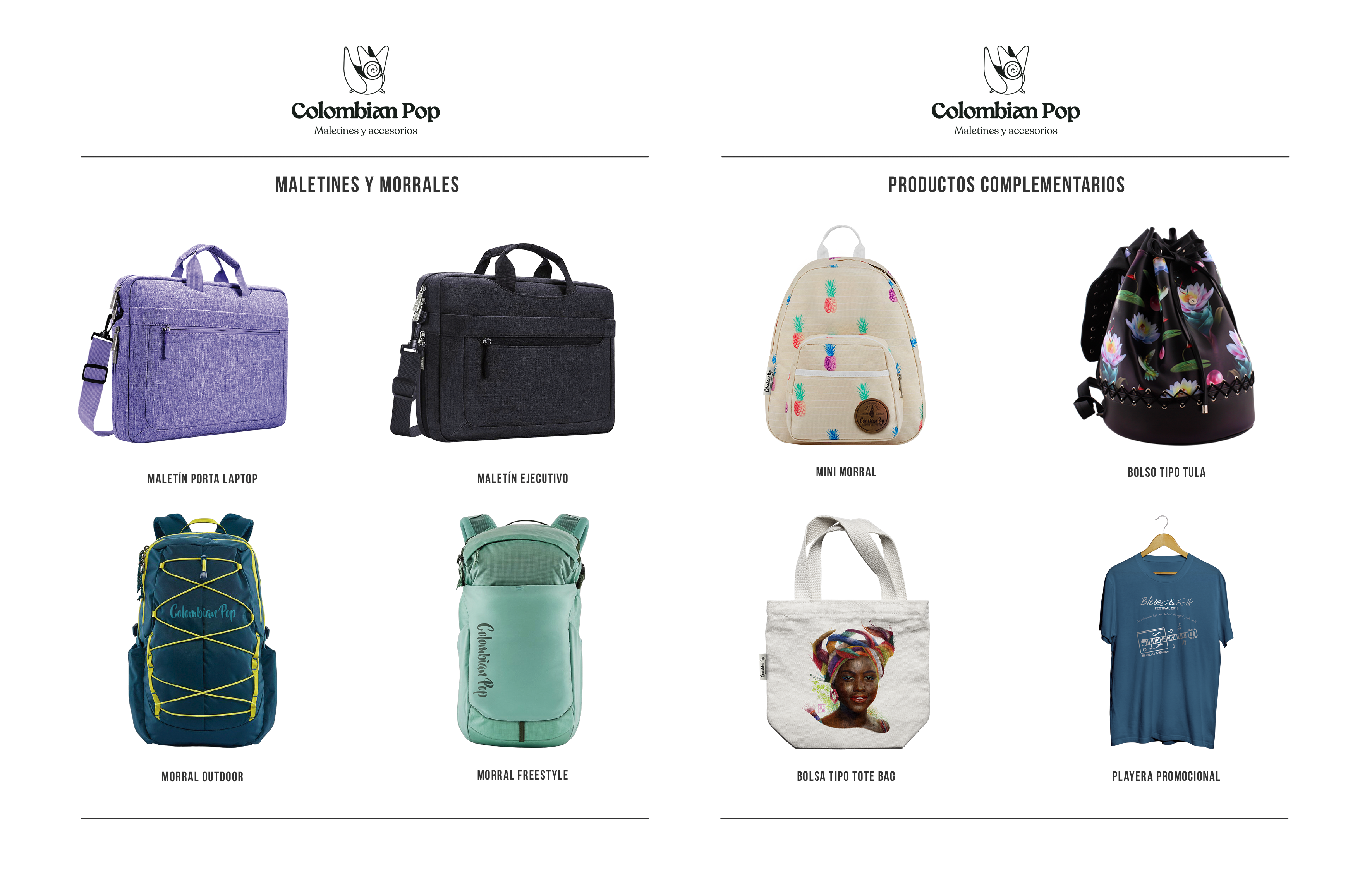 En Colombian Pop creamos artículos de mano personalizados que responden a las necesidades del día a día, como el transporte de dispositivos tecnológicos y el uso práctico en contextos profesionales, para todo tipo de personas. También desarrollamos productos textiles para empresas, ideales para fortalecer la identidad de marca a través de regalos corporativos, promociones y acciones de comunicación visual.